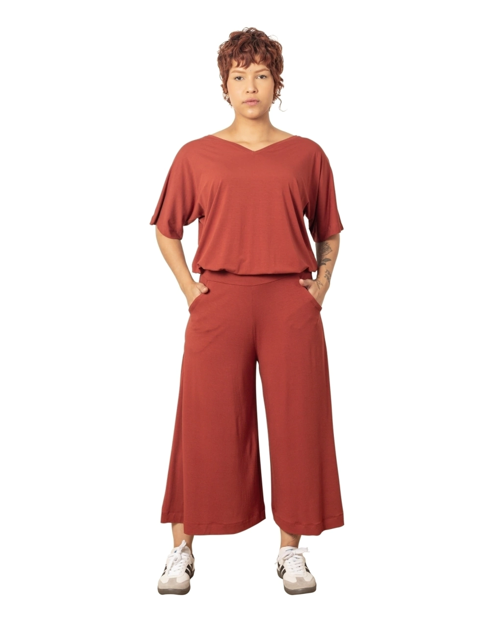 Muito confortável. Cós com elástico. Bem solta no cavalo e no quadril.