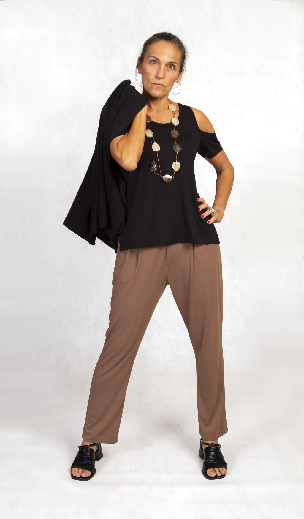 laterais, e costas um pouco mais compridas que a frente. Ombros vazados com arremate em viés.