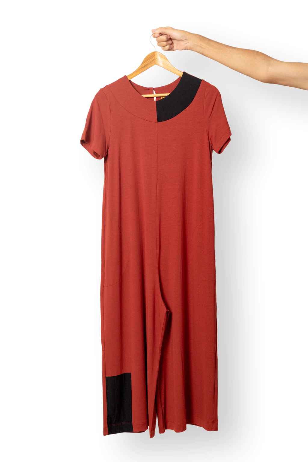 Modelagem confortável. Solto no corpo e no cavalo. Detalhe em outra cor na gola e em uma das pernas. Dois botões para fechamento nas costas. Bolsos laterais embutidos.