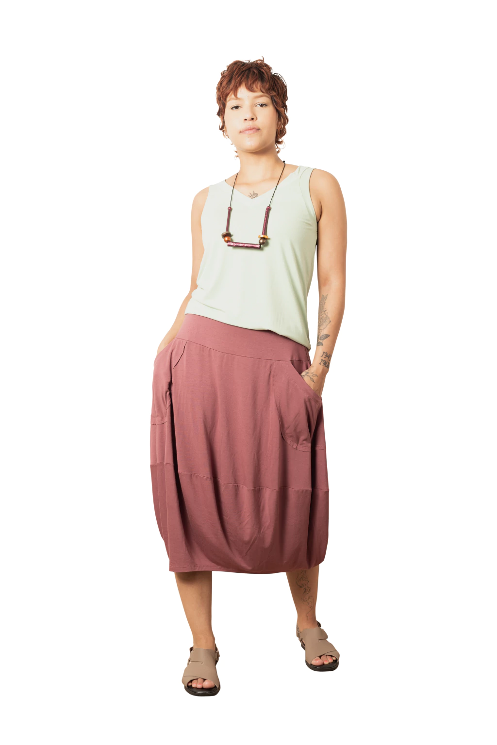 Modelagem arredondada. Elástico no cós. Solta no quadril e afunila na barra. Bolsos frontais. Modela a silhueta.