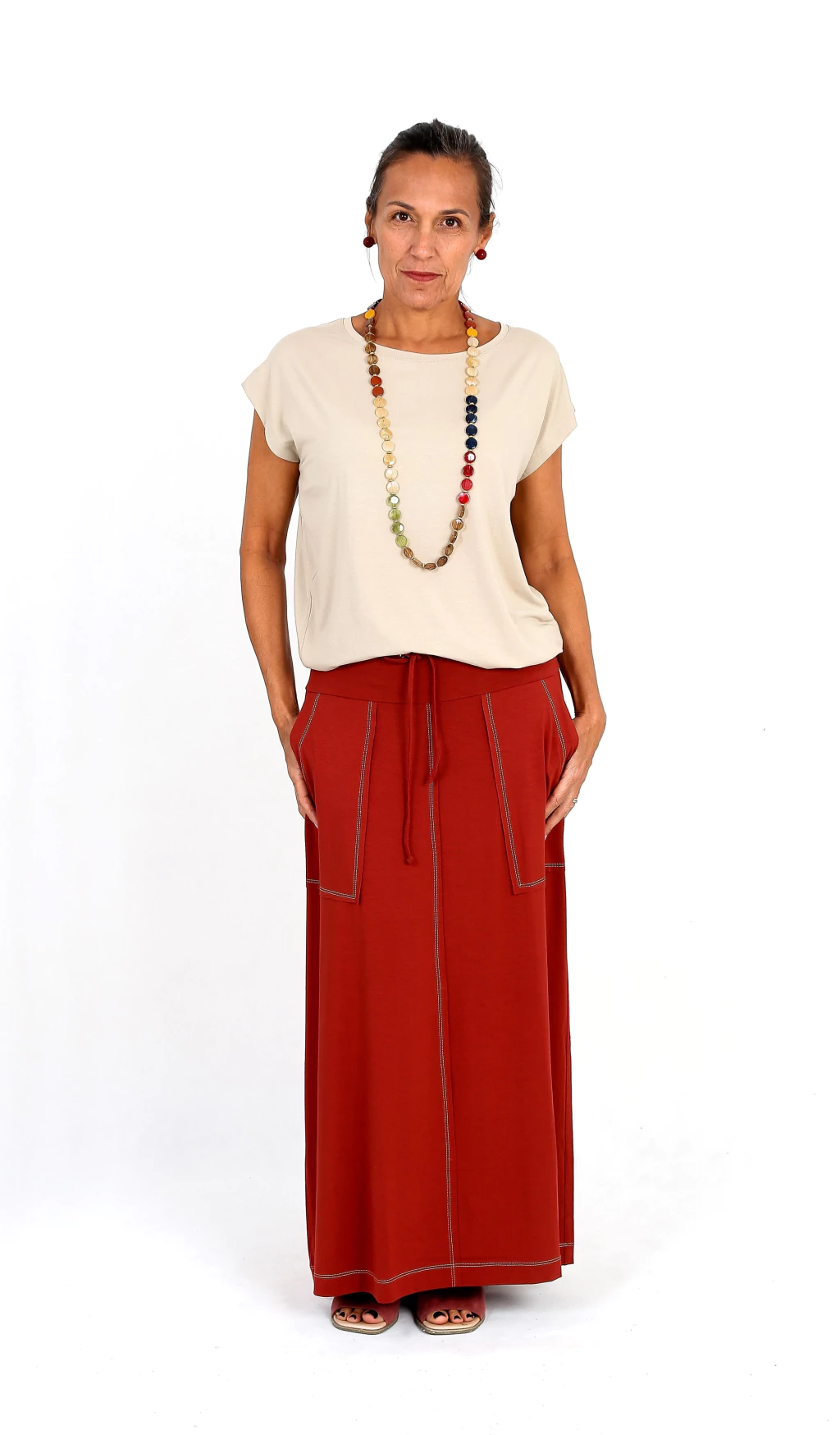 Pespontos em tom cru nos bolsos, na barra e nos recortes verticais. Cós com cordão.