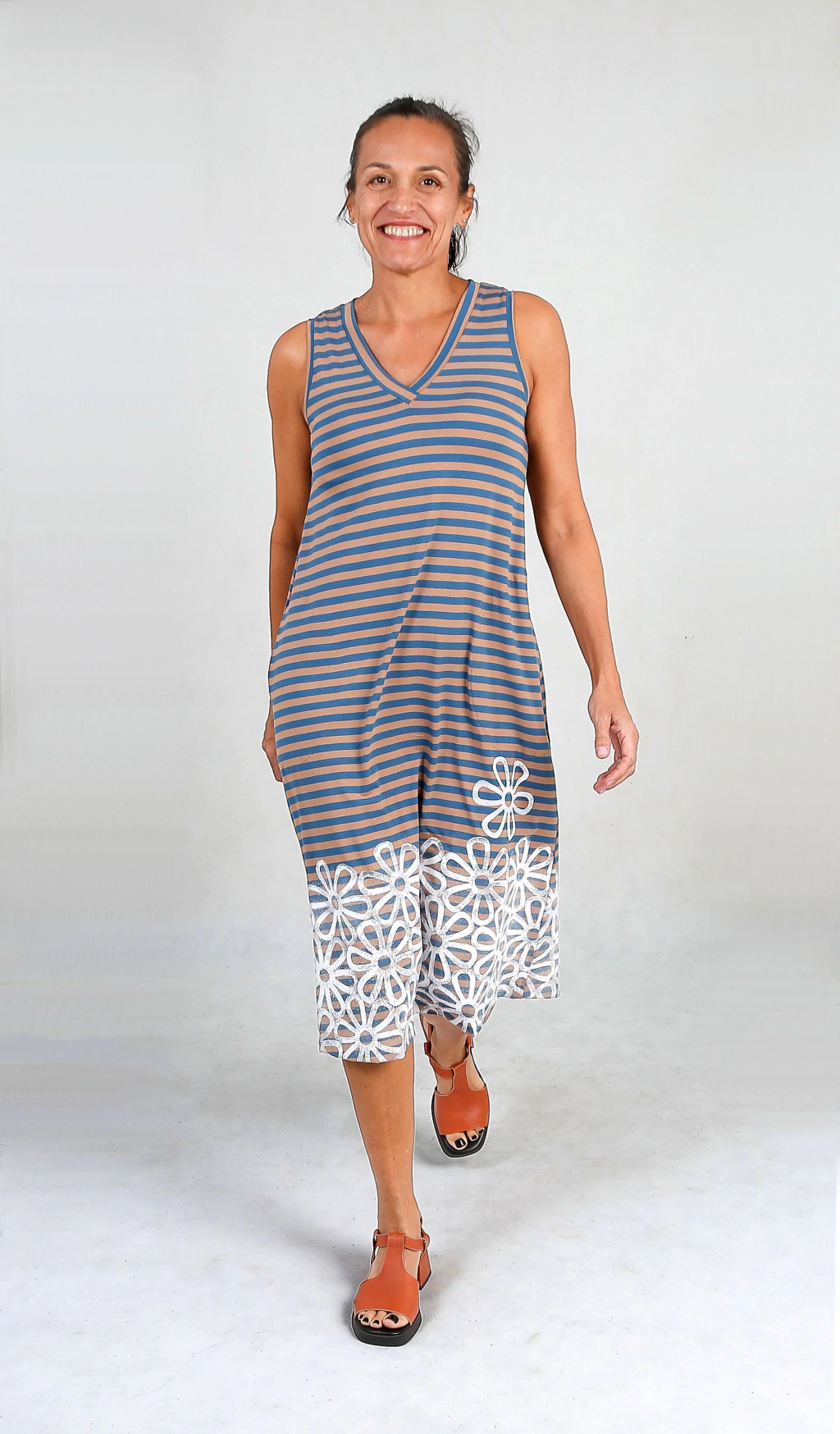 Bolsos frontais embutidos. Comprimento midi. O destaque deste vestido é a pintura,